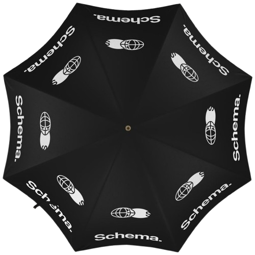 Built for downpour and downfall alike, this piece doesn’t shield as much as it asserts. Black canopy stretched wide, stamped with symbols that cut through the grey. Every panel speaks — repetition, insistence, inevitability. It folds down to nothing, then opens like a declaration overhead. Not protection. Presence.